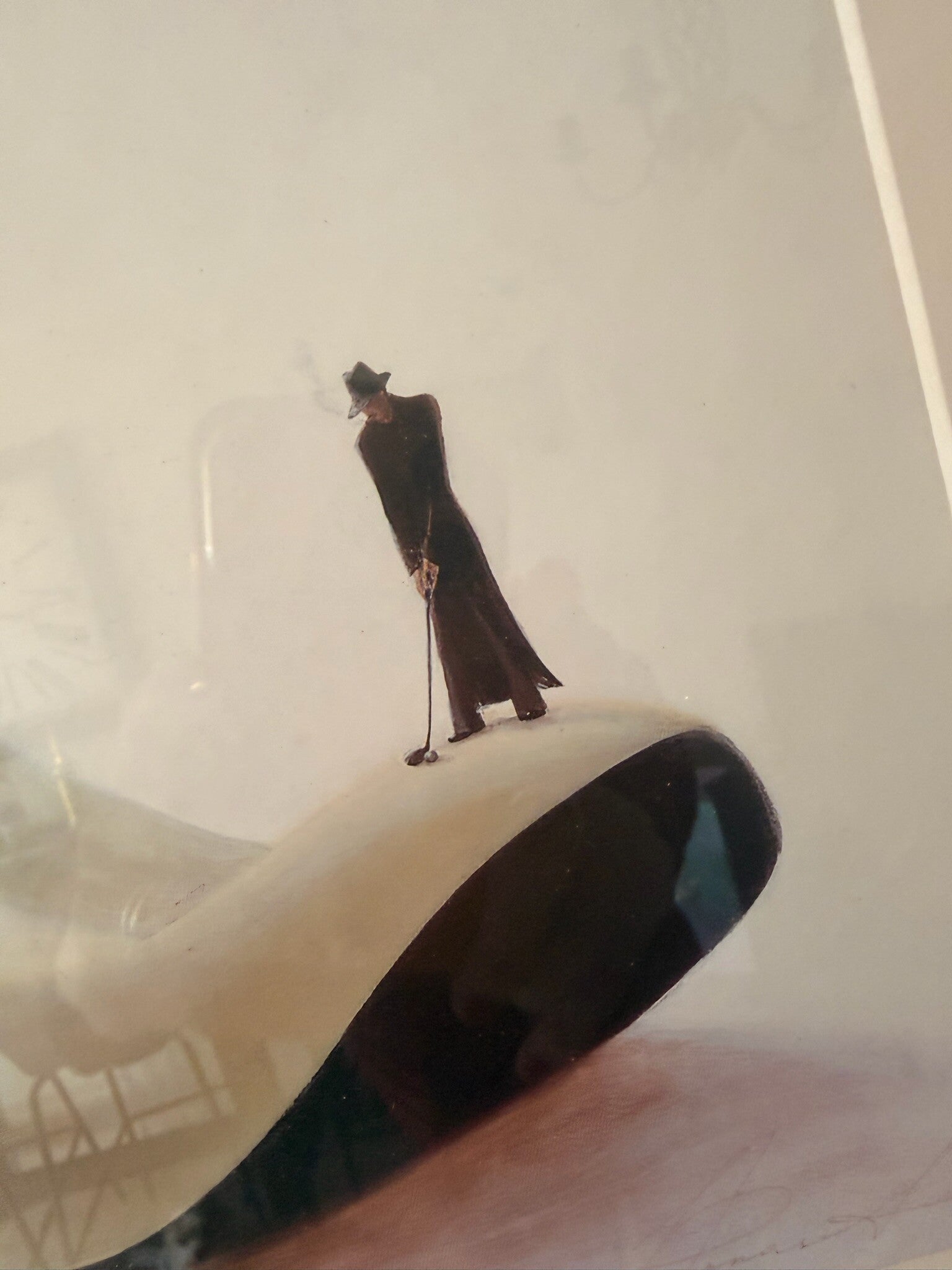 Unusual print with a high heeled shoe and golfer. frame measures 19.5 inches square
